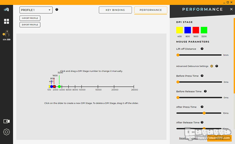 퍼포먼스 메뉴는 DPI 설정과 BAMF 2.0 센서를 사용하여 최다 26,000dpi 및 모션싱크 외 다양한 디바운스 딜레이를 조절하는 기능이 업데이트되었네요.