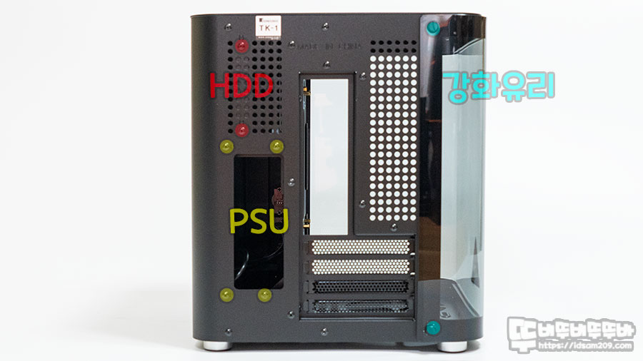 그리고 샤시 뒤쪽 부분을 살펴보면 H로 표기된 2개의 HDD 가이드 결합 나서, 그리고 P로 표기된 4개의 PSU 브라켓 고정 나사만 시스템 조립 시 사용하게 되며 그 외의 나사는 건드릴 필요가 없습니다.