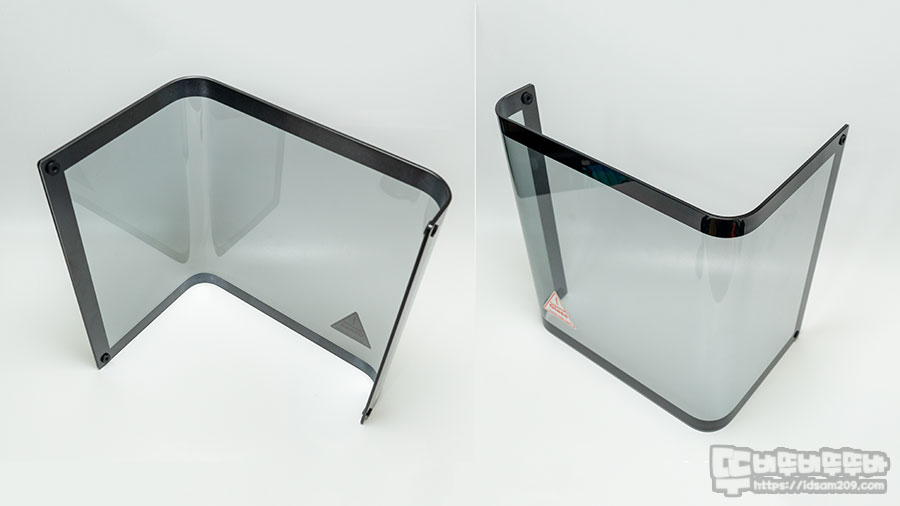 2번의 밴딩이 적용된 강화유리 패널은 파손을 방지 및 파손 시 파편이 흩어지지 않도록 스모키 컬러의 비산방지 보호 필름이 부착되어 있는 게 특징으로 스마트폰에 부착하는 보호필름처럼 깔끔해서 전혀 부착한 티가 나지 않네요.