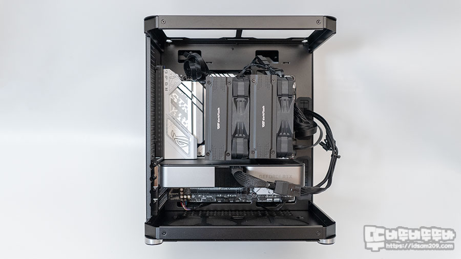 파워 서플라이 200mm 이하, CPU 쿨러 165mm 이하, 그래픽 카드 280mm 이하 상단 120mm 쿨러 2개, 하단 120mm 쿨러 2개를 지원합니다.