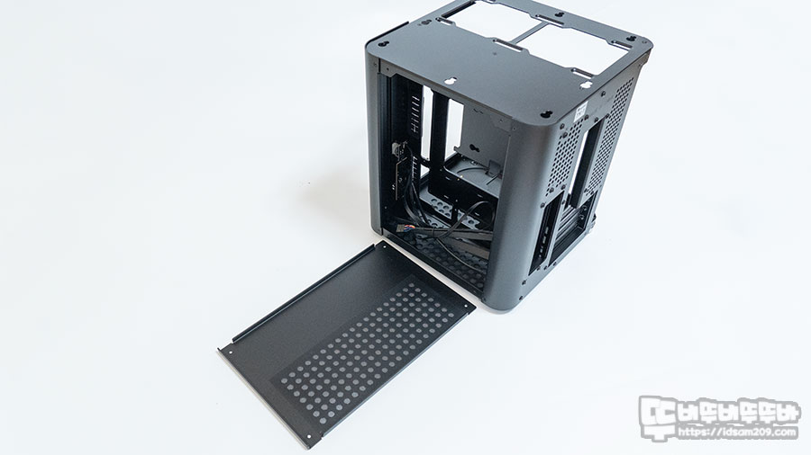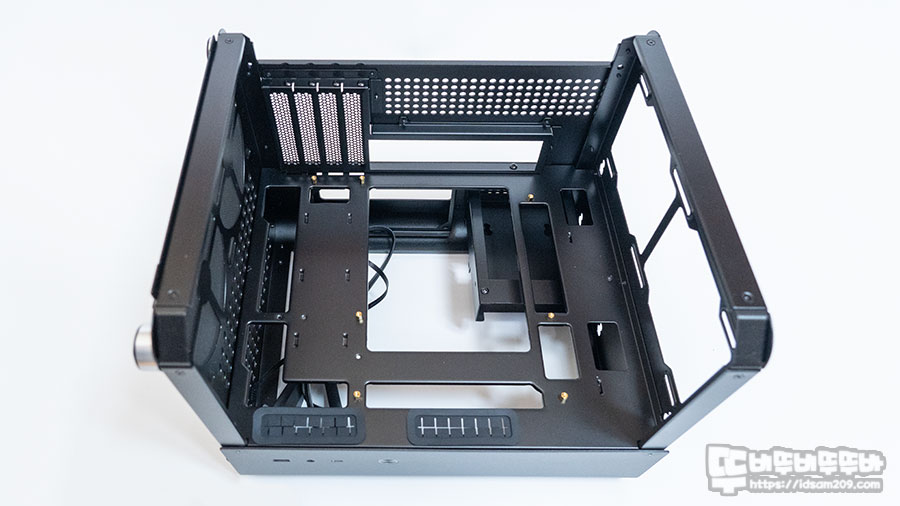 상판에 부착된 스티커 표기처럼 ← 방향으로 밀어서 오픈하는 슬라이딩 방식이 적용된 2.5T의 두툼한 상판은 샤시에 8자 형태의 크기가 다른 타공 부분의 넓은 쪽에서 좁은 쪽으로 밀어서 고정하기에 샤시와 상판이 결합되어 튼튼함이 느껴지며 쿨러가 장착되는 상단 샤시와 상판의 경우 공기가 배출되는 부분이라 그런지 먼지 필터는 제공되지 않습니다.