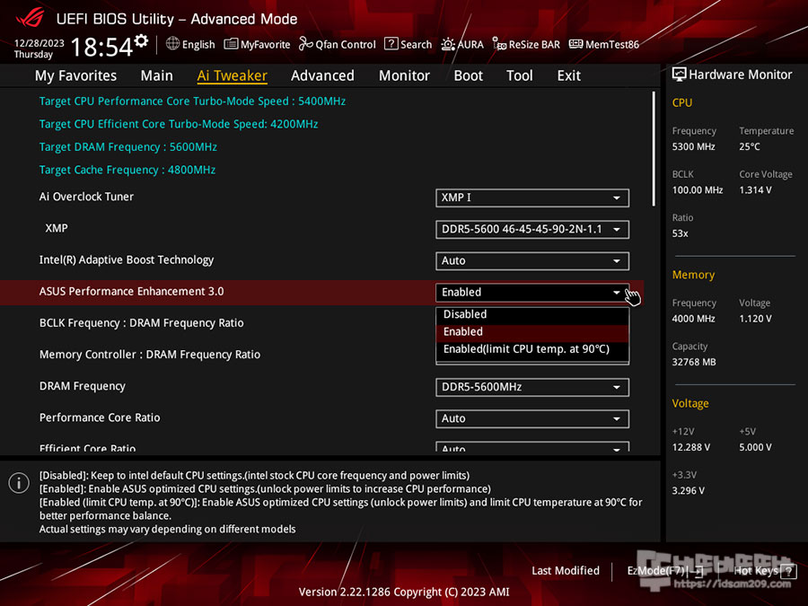 ASUS Performance Enhancement 3.0 메뉴에서 CPU 온도를 90도로 제한한 상태에서 성능을 높여주는 간단한 방식이기에 부담 없이 사용할 수 있는 기능으로 언더볼팅과 조합하여 어떤 퍼포먼스를 보여주는지 알아보겠습니다.