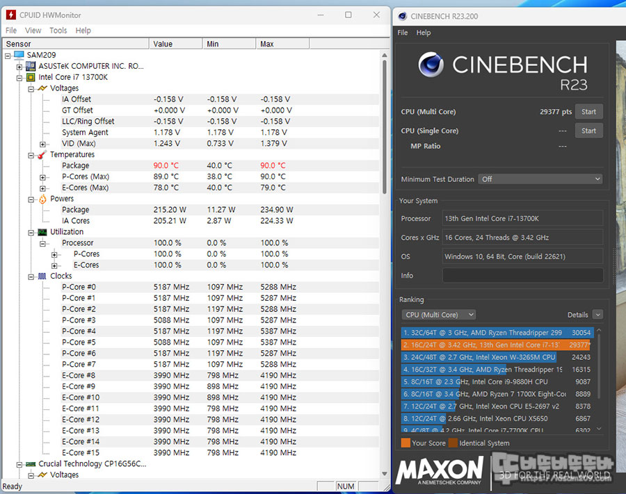 ASUS Performance Enhancement 3.0 활성화에 -0.15V 언더볼팅을 적용하여 테스트를 해보니 오.... 이게 언더볼팅의 힘인가? 전력소비도 조금 더 낮아지면 29,377 pts 점수를 보여줍니다.