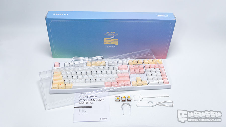 87키 배열의 텐키리스 모델인 GK777SE 뽀송은 키보드 본체, 여분 키캡, 키캡 리무버, 스위치 리무버, 청소용 브러쉬, 매뉴얼 그리고 투명 커버로 구성되어 있습니다.