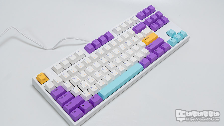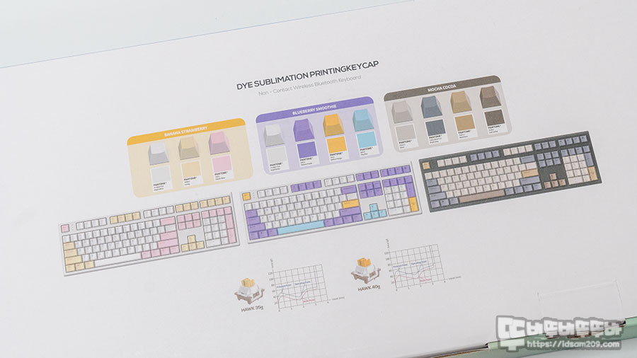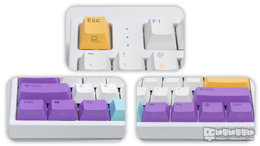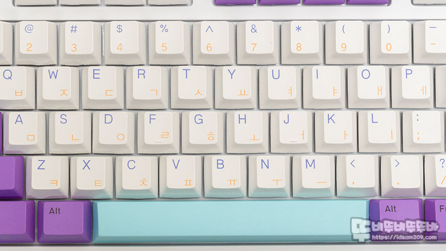 화이트 베이스에 자주색 모디 배열과 포인트 컬러 조합으로 구성된 블루베리 스무디 키캡 제품은 한글/영문 염료승화 방식의 PBT 키캡이 사용된 게 특징인데요.