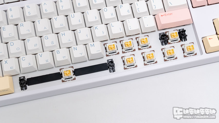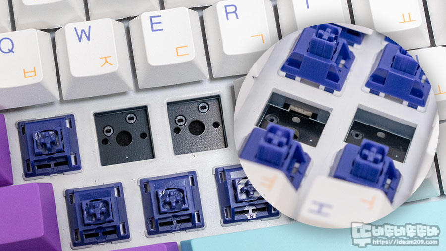 염료승화 방식의 PBT 키캡 그리고 핫스왑 방식의 기판 그리고 기판과 보강판 사이의 실리콘 흡음재 모습.