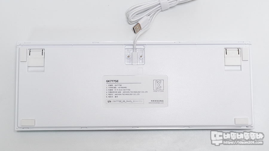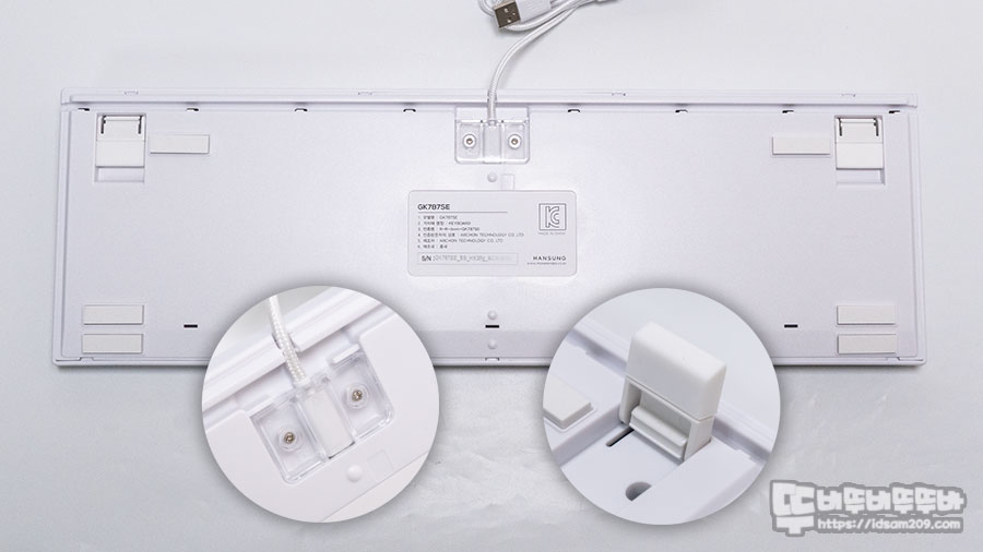 키보드 하판에는 투병 캡으로 고정되었지만 캡을 제거하면 케이블 탈부착이 가능한 구조 그리고 미끄럼을 방지하기 위한 두툼한 패드와 높이 조절 다리 구성을 확인할 수 있습니다.