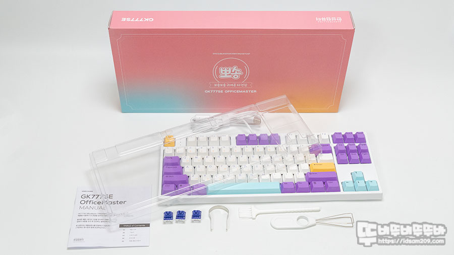 87키 배열의 텐키리스 모델인 GK777SE 뽀송은 키보드 본체, 여분 키캡, 키캡 리무버, 스위치 리무버, 청소용 브러쉬, 매뉴얼 그리고 투명 커버로 구성되어 있습니다.