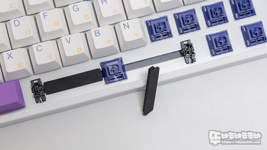 기판 기준 하판 사이에 그리고 보강판 사이에 이중으로 흡음재를 사용과 스페이스 바 사이 공간에도 실리콘 캡으로 혹시 모를 소음도 막아주는 꼼꼼함을 제공하네요.
