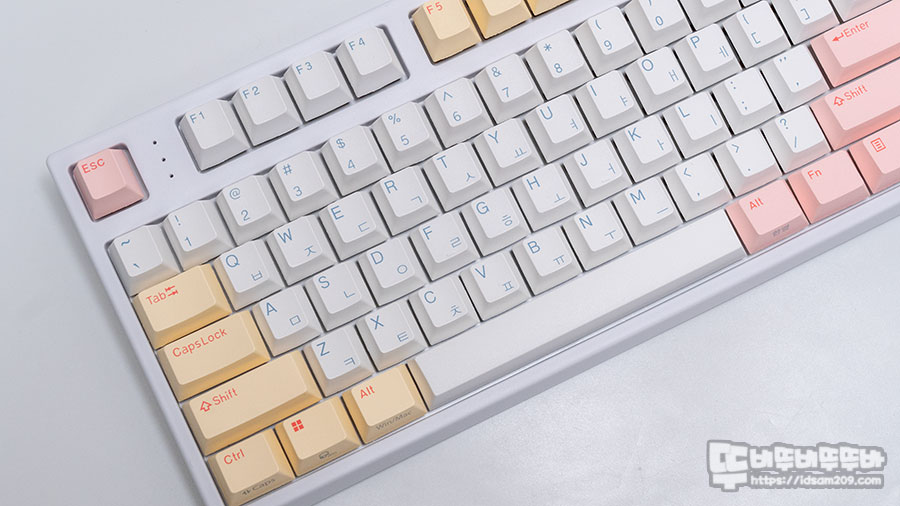 염료승화 방식의 PBT 키캡이 사용된 제품답게 깔한 게 좋은 편인데 선명하지 않은 각인이 조금 아쉽네요.