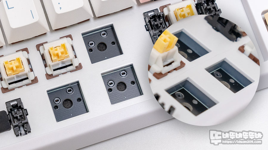 스위치 교체가 용이한 핫스왑 방식이 적용된 제품이지만 LED 백라이트는 지원하지 않으며 보강판과 기판 사이에 실리콘 흡음재가 사용된 것을 확인할 수 있습니다.