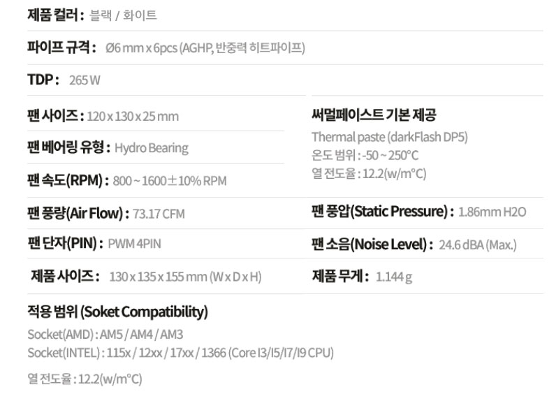 6mm 지금의 히트파이프 6개, 265W TDP, 하이드로 베어링 팬 사용으로 800~1600 rpm, 타워 높이 155mm 지원 등이 눈에 띄네요.