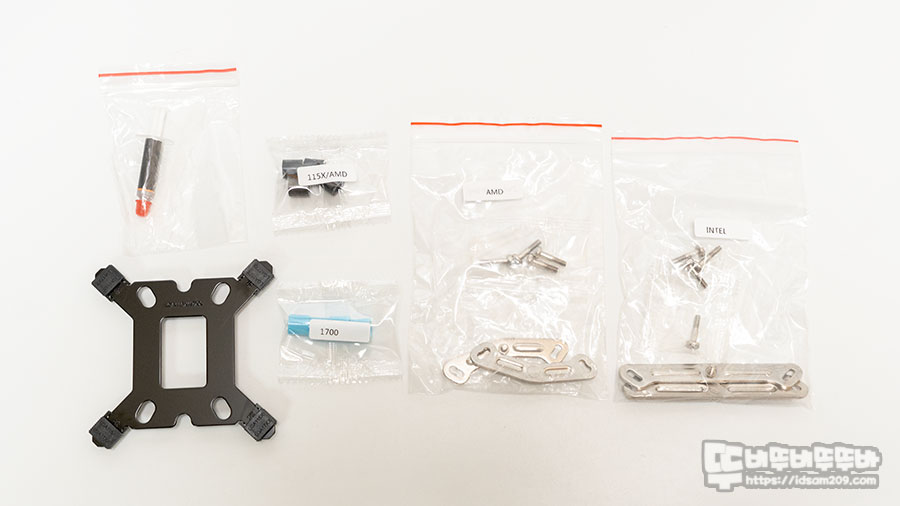 부자재는 써멀 구리스와 도포용 주걱, 인텔 백플레이트, AMD 마운트 및 백플레이트 고정 나사, 인텔 마운트 및 백플레이트 고정 나사, 17xx 용 스탠드 오프, 115x 및 AMD 용 스탠드 오프로 구성되어 인텔과 AMD 플랫폼 호환을 지원합니다.