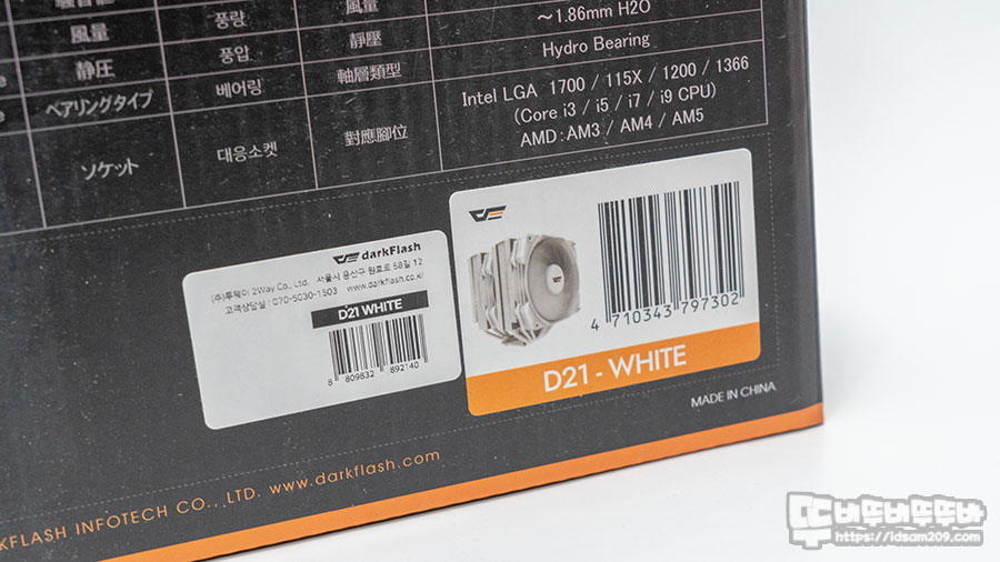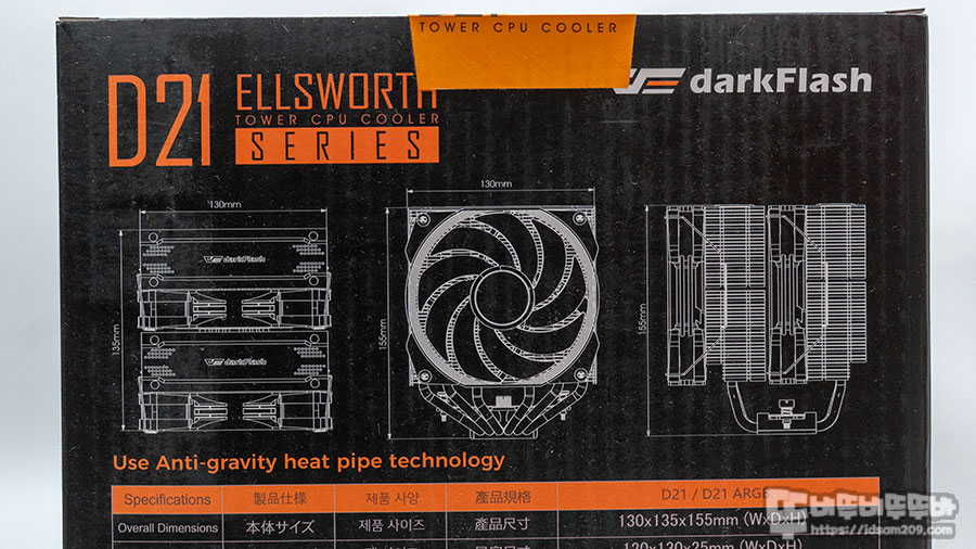 다크플래쉬 Ellsworth D21 CPU 쿨러 패키지에는 제품의 실물 이미지와 모델명 그리고 특징을 표현하고 있고요.