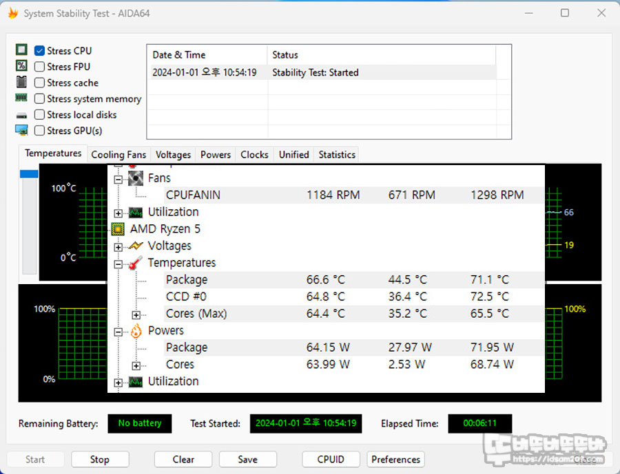 쿨러 성능을 확인하기 위해 AIDA64의 시스템 안정화 테스트로 Stress CPU로 6분간 테스트 시 약 66.6℃ 최대 피크 71.1℃ 온도를 보여주며 쿨링팬은 1184rpm으로 정숙한 소음을 들려주었습니다.