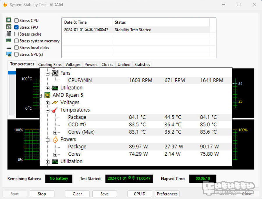 AIDA64의 시스템 안정화 테스트로 Stress FPU로 6분간 테스트 시 약 84.1℃ 최대 피크 84.1℃ 온도를 보여주며 쿨링팬은 1603rpm으로 살짝 높지만 심각하게 높은 소음은 없는 편입니다.