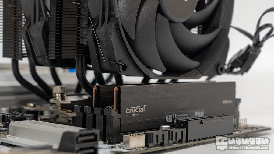 시스템 조립에 사용된 마이크론 Crucial DDR5-5600 CL46 PRO 메모리는 방열판이 부착되어 있는 모델이지만 LED가 들어간 튜닝 메모리와 비교 시 높이가 낮은 편이지만 메모리가 살짝 높은 경우 전면부의 쿨링팬은 살짝 올려서 장착하면 간섭 없이 사용할 수 있는데요.
