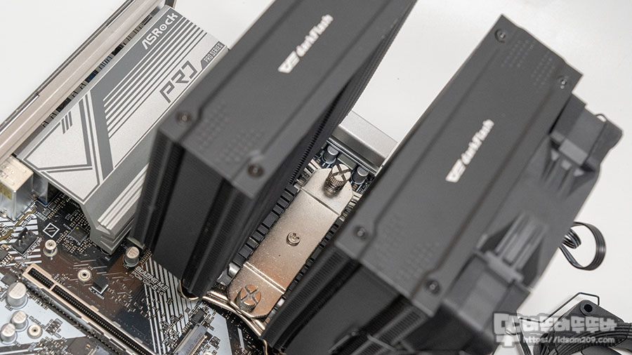 다크플래쉬 Ellsworth D21 CPU 쿨러는 성능 좋고 정숙한 쿨링팬을 사용하는 제품이지만 듀얼 타워가 생각보다 가깝게 붙어 있는 형태이기에 간격을 살짝 늘려줘야 사용에 편하니 참고하시고요.