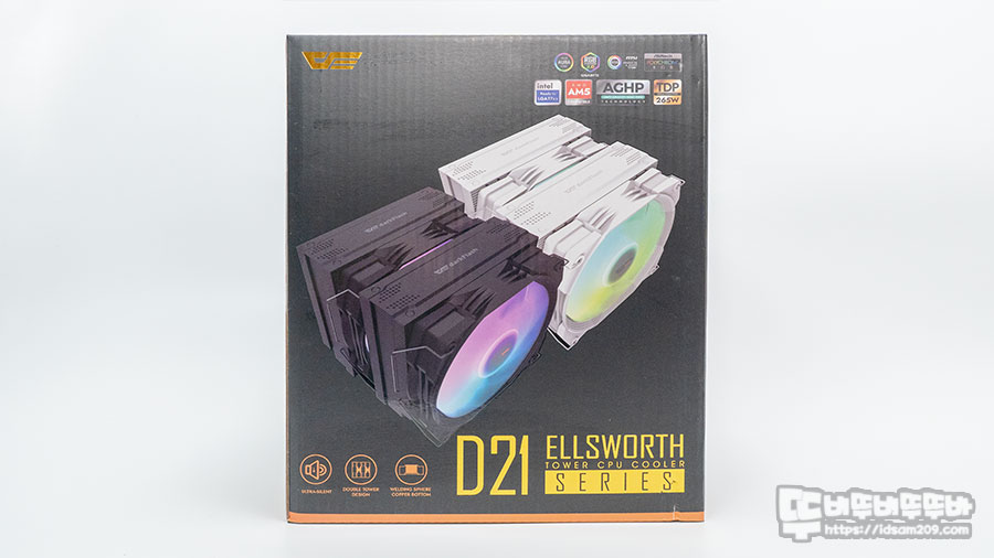 다크플래쉬 Ellsworth D21 CPU 쿨러 패키지에는 제품의 실물 이미지와 모델명 그리고 특징을 표현하고 있고요.