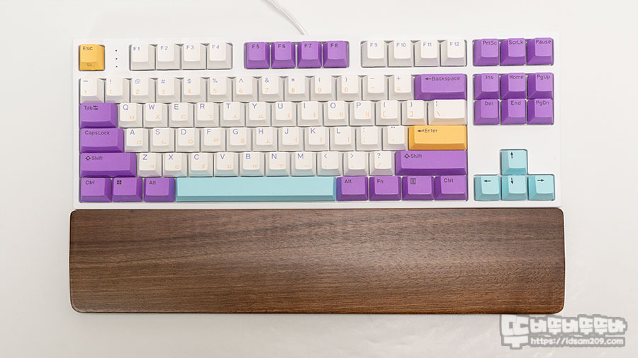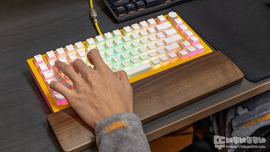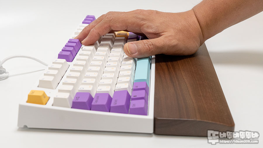 한성컴퓨터 텐키리스 뽀송 키보드에 월넛 팜레스트를 사용 모습.