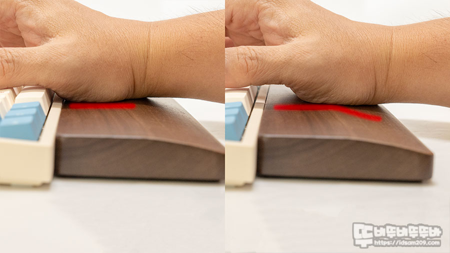 특히 제닉스 엑스팜 호두나무 월넛 팜레스트와 같이 경사각이 적용된 제품이 좋은 이유는 목재가 평편한 상태로 되어있는 경우 손바닥 끝부분으로 지탱되기에 오래 사용하게 되면 손목 부분에 통증을 유발하지만 경사각이 있는 경우 손바닥 부분이 경사면에 닿아 손목이 편안한 인체공학 느낌을 주기에 가장 이상적인 디자인이라 볼 수 있습니다.