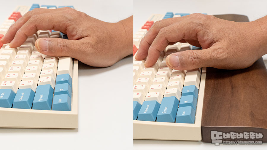 레오폴드 키보드의 경우 키보드 하우징 앞쪽의 높이가 16mm, 팜레스트는 21mm로 손목 꺾임 없이 편안하게 타이핑할 수 있었습니다.