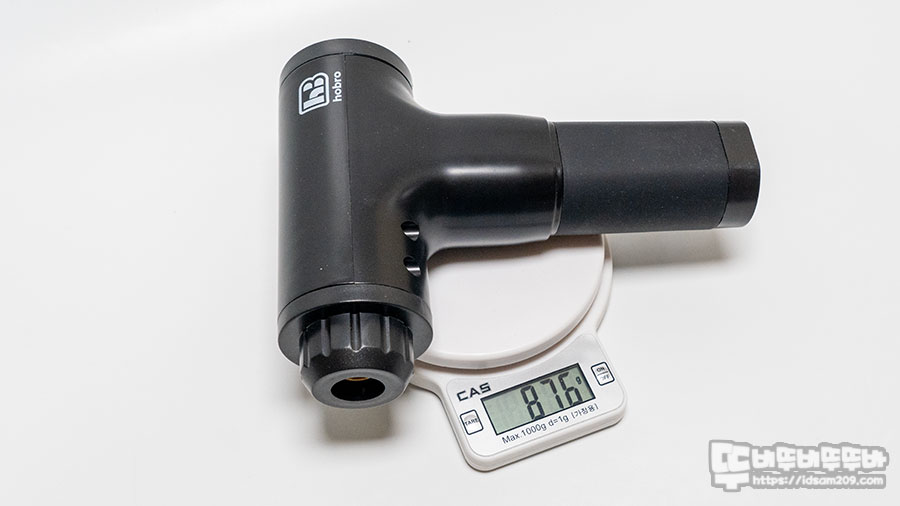 마사지건 베이스는 876g 무게감을 보여주지만 제품의 과반수의 무게는 손잡이에 몰려 있어서 그런지 마사지건 그립 시 어느 정도 균형감을 제공합니다.