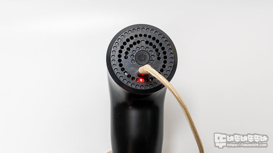 마사지 건을 충전할 때엔 충전 단자 밑으로 Red LED 인디케이터로 충전 중임을 확인할 수 있으며 완충 시 Green LED로 표현되고요.
