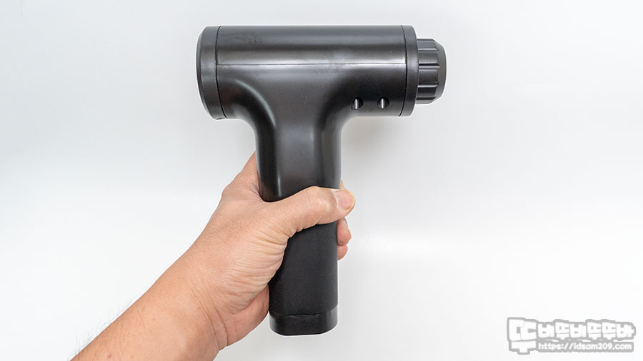 먼저 마시건을 살펴보면 215mm X 170mm X 65mm 크기로 손잡이 부분은 성인 남성이 잡기에 조금 크게 느껴지는데 마사기 건의 핵심이라 할 수 있는 배터리가 손잡이에 내장되어 그런지 살짝 두께감이 있는 편입니다.