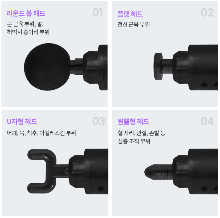 마사지 헤드는 다양한 부위에 최적화로 사용할 수 있는 4가지 종류의 헤드를 제공하고 있으며 헤드를 교체하는 방식도 뽑고 끼는 방식이라 손쉽게 사용할 수 있었습니다.