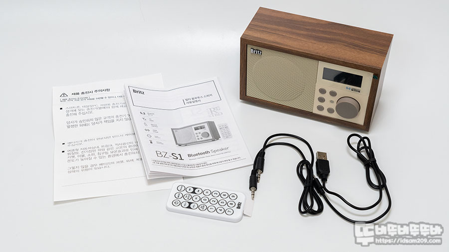 제품은 브리츠 BZ-S1 블루투스 스피커 본체, 리모컨, USB-C to A 충전 케이블, 3.5mm AUX in 케이블, 사용 설명서로 구성되어 있습니다.