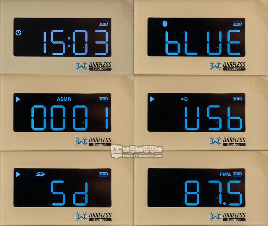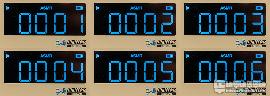 1) 비 / 2) 새 / 3) 개울 / 4) 카페 / 5) 화이트 노이즈 / 6) 애완동물이 좋아하는 소리 (아마도 간식 봉지 바스락거리는 소리인 듯) 순으로 선택하여 사용이 가능하며 LCD 디스플레이는 5초가 지나면 시계로 표현되니 참고하세요.