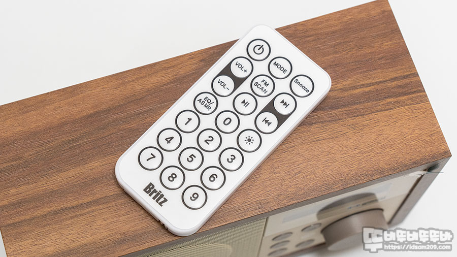리모컨 기능을 살펴보면 전원, 재생, 트랙 이동, LCD 밝기 조절 버튼 그 외는 mode 변경, 알람 기능 사용 시 활용할 수 있는 스누즈, FM 라디오 주파수 스캔, 볼륨 조절, EQ/ASMR 사운드, 라디오 주파수를 직접 눌러서 사용할 수 있는 숫자 버튼 구성을 확인할 수 있으며 화이트 베이스에 블랙 컬러 각인이 되어 있어서 가독성이 좋은 편입니다.