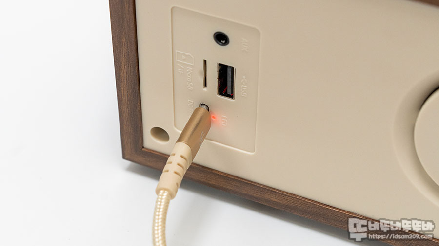 전면부의 컨트롤 버트는 재생/일시 정지, 트랙 이동이 각인된 기능 버튼과 전원 버튼, 모드 버튼 그리고 볼륨 노브로 구성이 되어있어 직관적인 제어가 가능하지만 거치된 상태에서 조작하는 경우 누르는 힘에 스피커가 뒤로 밀릴 수 있으니 가급적 리모컨을 이용하시는 걸 추천드립니다.