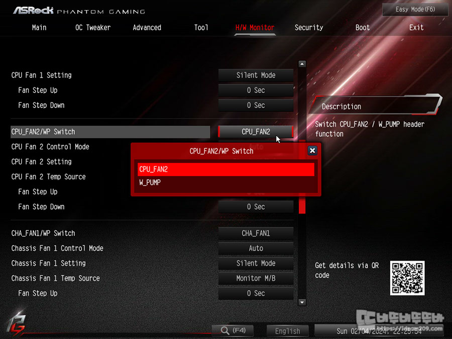CPU 팬 사용 시 팬의 쿨링 성능 선택과 FAN/WP 커넥트의 경우 팬 또는 워터블럭 사용을 선택할 수 있어 제품에 맞는 설정이 가능합니다.