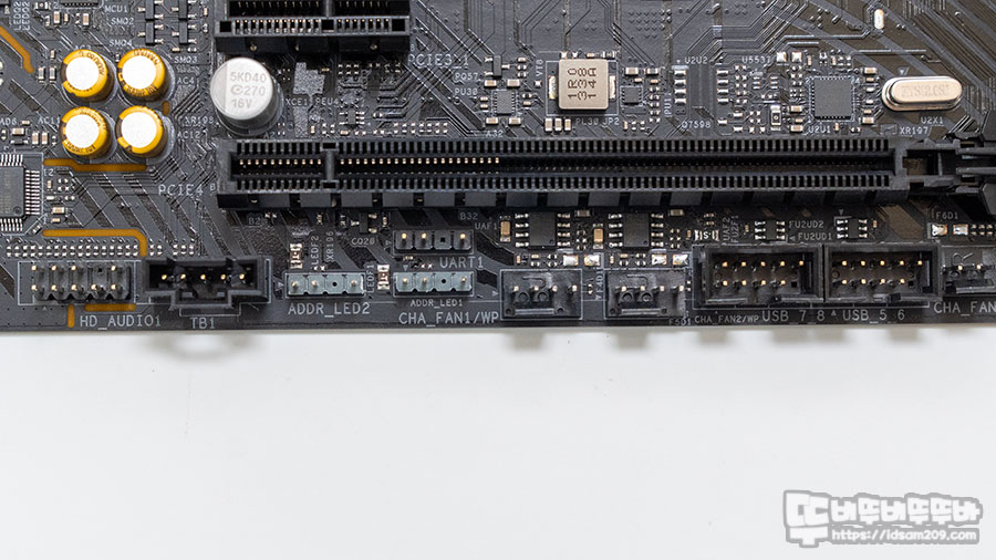메인보드 상단에는 최대 1A(12W) 전력을 지원하는 CPU 팬 소켓, M.2 슬롯 앞쪽에는 최대 2A(24W) 전력을 지원하는 CPU/워터 펌프를 지원하는 소켓으로 구성되어 있어 시스템 빌드에 참고하시기 바랍니다.