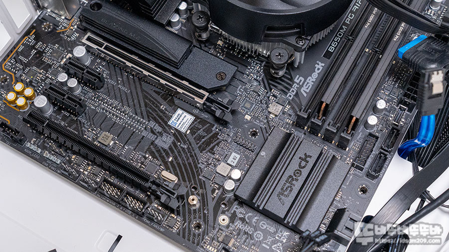 M.2 슬롯은 CPU 아래에 PCIe Gen5 x4 속도를 지원하는 M.2 슬롯에는 Blazing 글씨가 각인된 히트싱크를 지원하며 우측 하단에 ASROCK 로고가 각인된 B650 칩셋 아래에는 Gen4 x4 속도를 지원하는 M.2 슬롯으로 구성되어 있습니다.