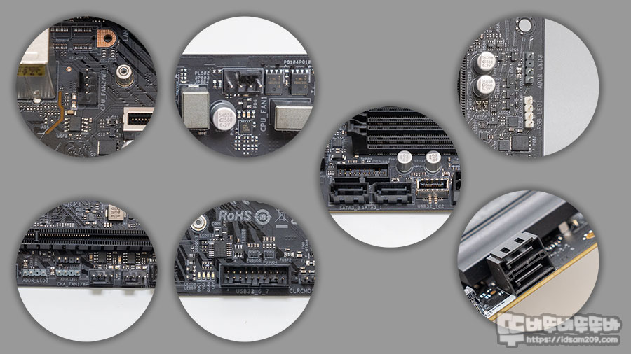 메인보드를 테두리를 둘러서 위치한 CPU 팬, ARGB/RGB 커넥트, USB 3.2 Gen1 Type-C, USB 3.2 Gen1 포트, SATA 포트 그리고 중앙 M.2 슬롯에 위치한 CPU 팬 또는 워터 펌프 겸용 소켓, 보드 아래쪽에 ARGB 커넥트, 부팅 시 문제점을 알려주는 LED 인디케이터, USB 3.2 Gen1 포트 등 다양한 포트 구성으로 시스템 구성에 편리성을 제공합니다.