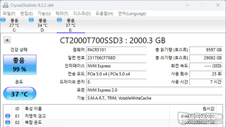 PCIe Gen5 x4의 경우 소문대로 높은 성능과 더불어 발열이 있다고 들었는데 다음에는 쿨링팬이 내장된 히트싱크를 이용하여 테스트를 해봐야겠네요.