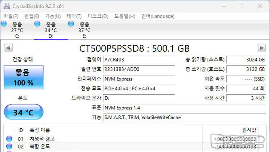크루셜 P5 Plus 500GB 모델의 경우 히트싱크 덕에 최대 피크치 온도가 55도까지 오르는 것을 확인할 수 있었고요.