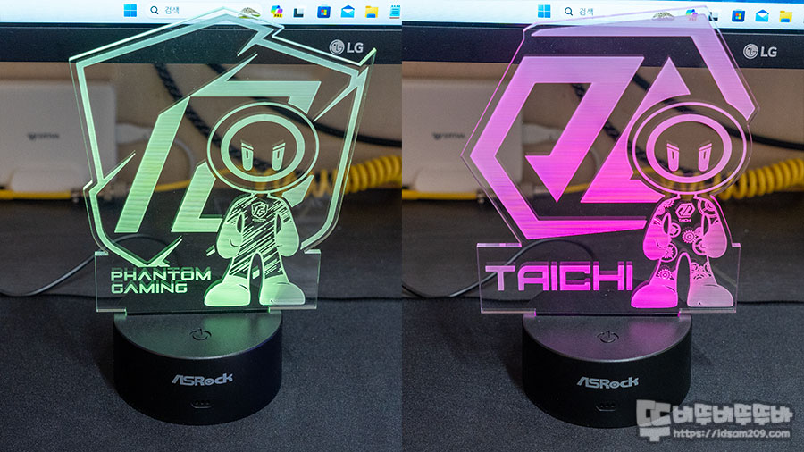 ASROCK 일루전 램프는 로고와 펜텀 게이밍, 타이치 캐릭터가 음각으로 각인된 아크릴판을 LED 빛을 발산하는 베이스에 끼우면 음각으로 각인된 부분에 LED 빛이 부딪히면서 블링 블링한 LED 라이팅 효과를 주는 제품인데요.