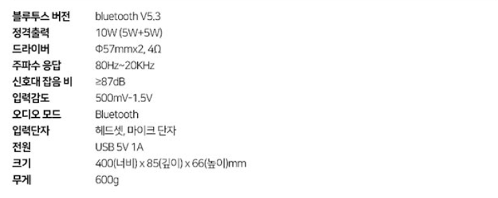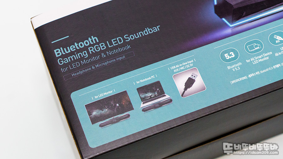 블루투스 5.3, 57mm 드라이버 듀얼 구성, 5W+5W=10W 출력, 응답 주파수 80Hz~20kHz, 전원 5V/2A, RGB LED 라이팅 지원, 크기 400 X 85 X 66mm, 무게 600g으로 PC, 노트북, 콘솔 게임기 등 다양한 기기에 활용이 가능합니다.