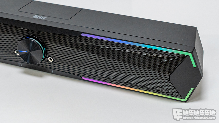 브리츠 Britz BZ-AK45 사운드 바는 볼륨 컨트롤과 헤드폰, 마이크 연결 단자가 중앙에 위치하고 있어 직관적인 사용이 가능하며 사운드 바 양쪽 사이드에는 테두리 라인처럼 보이는 LED 디퓨저 라인을 내장하고 있고요.