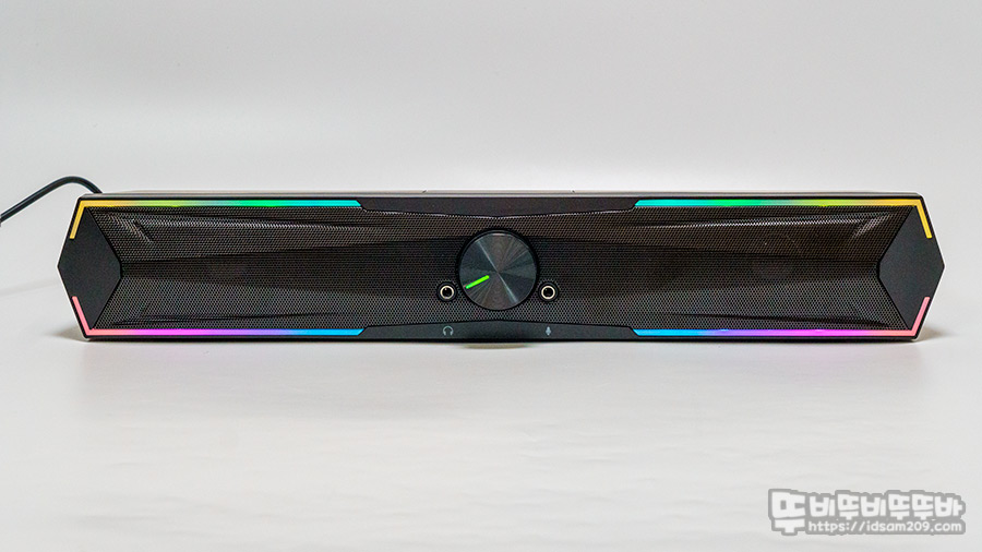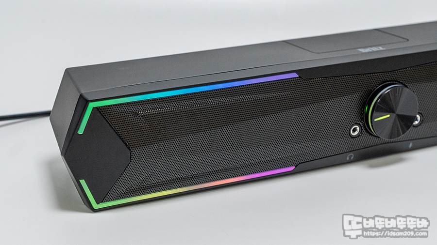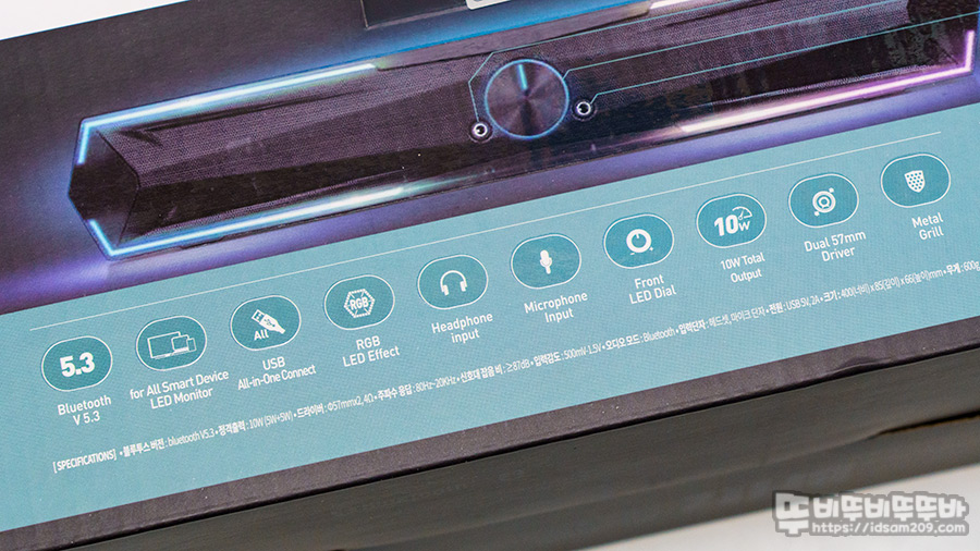 블루투스 5.3, USB 연결 방식, RGB LED 효과, 헤드폰 & 마이크 입력, 전면 LED 다이얼, 10W 출력, 57mm 듀얼 드라이버, 전면 메탈 그릴 등의 내용과 전면 볼륨 다이얼과 헤드폰, 마이크 입력 단자에 대한 구성 스펙 정보를 확인할 수 있는데요.