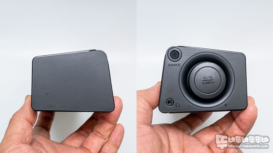 PC USB 연결 시 16비트 48kHz를 지원하는 사운드카드가 내장되어 있어 USB 스피커로 사용되며 제품의 오른쪽 사이드 부분에 USB/블루투스 소스 선택 버튼, 헤드폰 출력 단자, 볼륨 조절 및 푸시 방식의 On/Off 버튼의 간편한 조작으로 편리하게 사용할 수 있었습니다.