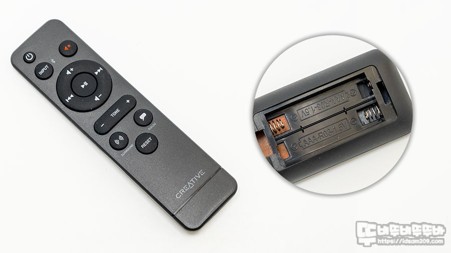 사운드 바 뒤쪽의 입력 포트는 15V 2A 전원 소켓, 펌웨어를 위한 USB-A 단자, USB-C 단자로 구성되어 있으며 리모컨을 제공하여 편리한 사용이 가능한데요.