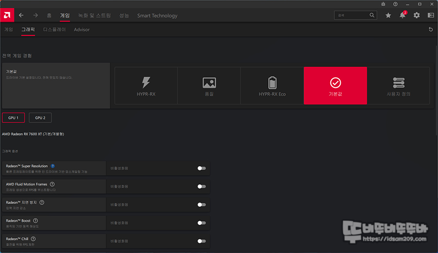 GPU 메뉴 아래 Enable AMD Fluid Motion Video 항목은 활성화되지 않으니 참고하세요.
