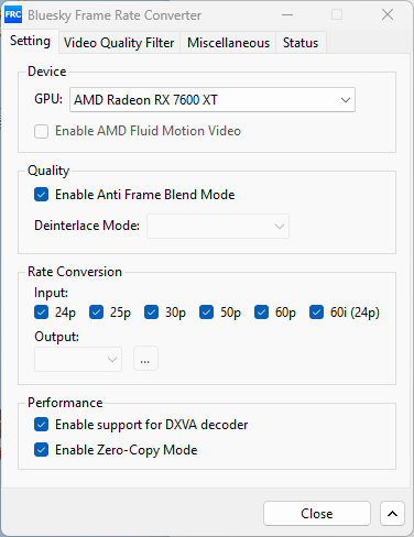 Bluesky Frame Rate Converter를 설치 후 실행하여 GPU를 선택하시고 위의 이미지와 같이 V 체크를 해주시면 됩니다.
