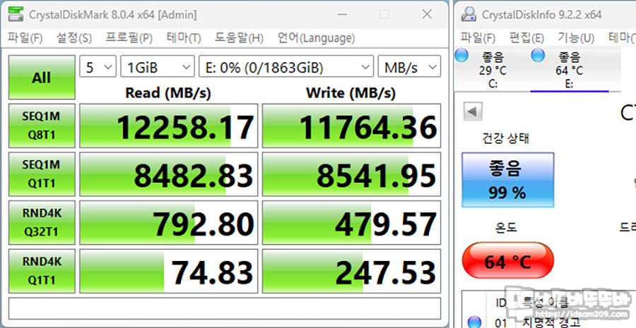 읽기보다는 작업량이 많은 쓰기 작업 시 온도가 피크치로 64도 정점을 찍었는데 Gen4 x4 제품에 비하면 확실하게 높은 편은 편이었습니다.