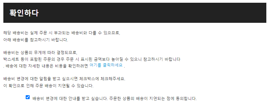 2월 초에 결재할 당시 이걸 인지하지 못하고 있었는데 보름이 지나도 배송이 되지 않아 주문내역을 확인하니 배송료가 200엔 추가된다는 내용이 있어서 동의하는 방법을 찾지 못하다가 3~4일 동의한다는 내용으로 문의 글을 남겼는데.....